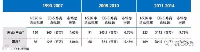 2014 年,在 I-526 申请获批量总排名中,印度位居第四,且预计其获批量会继续增长。2008 年以来,其 I-526 申请获批量增长近74%。在不算中国的情况下,2011年以后印度的 I-526 申请获批量占其他国家获批量总数的 7.41%。