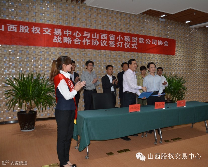 2014年5月15日,山西股权交易中心与山西省小额贷款公司协会签署了战略合作协议。参加此次签约仪式的机构代表还有:山西省金融办,省国信集团下属券商、担保等地方领头金融中介机构,以及省内知名小贷公司代表,一同见证赵志明董事长与樊三星会长代表双方在协议上签字。