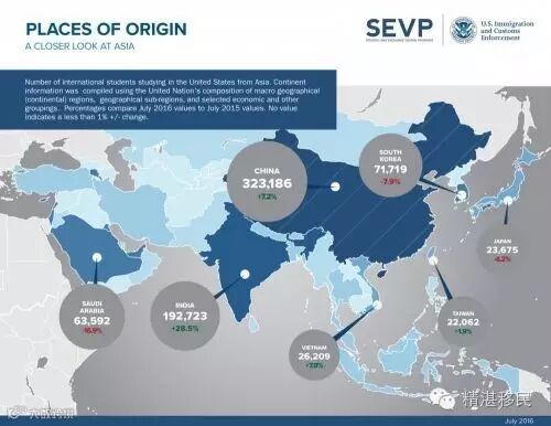 据美国侨报报道,根据2016年7月7日数据,在美国学校注册的持有F(学术学生)或M(职业学习学生)签证的国际学生有111万人,比去年增长了5.5%,其中有77%来自亚洲。与一年前相比,来自中国的留学生数量增长了7.2%,高于平均水平,中国依然是美国国际学生最大的来源国。