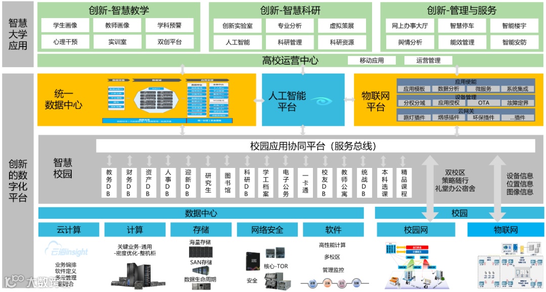以人工智能、物联网、移动互联、云计算、大数据等为代表的新兴技术,正逐步深入到高校的应用场景之中,数字化校园的建设正迈向智慧校园的创新阶段。智慧校园是在数字校园的基础上,以数据驱动实现智能创新,是高校信息化建设的迭代升级,包括对校园应用资源和物理场景的全面感知,对师生的教学、科研行为的智能感知识别,物理教学环境与在线虚拟教学应用的高度融合等,改变了师生对校园资源的感知和与应用交互的方式,资源与应用高度整合,构建起以学生为中心,应用交互明确、灵活、响应快速,校园可提供个性化的学习环境和智能化的生活环境,强调用户自主获取各类应用资源的创新应用模式,学校的信息化水平和师生的信息化能力达到全新高度。