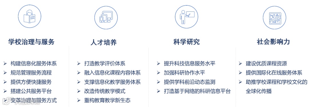 智慧校园建设涵盖教学、科研、管理和服务各个方面,是一体化的智能化教学、管理与服务平台,借助这个平台,高校可以实现校园的智慧管理、智慧运营,开展智慧教学,利用现代技术推动人才培养模式的改革,实现规模化教育与个性化培养的有机结合。