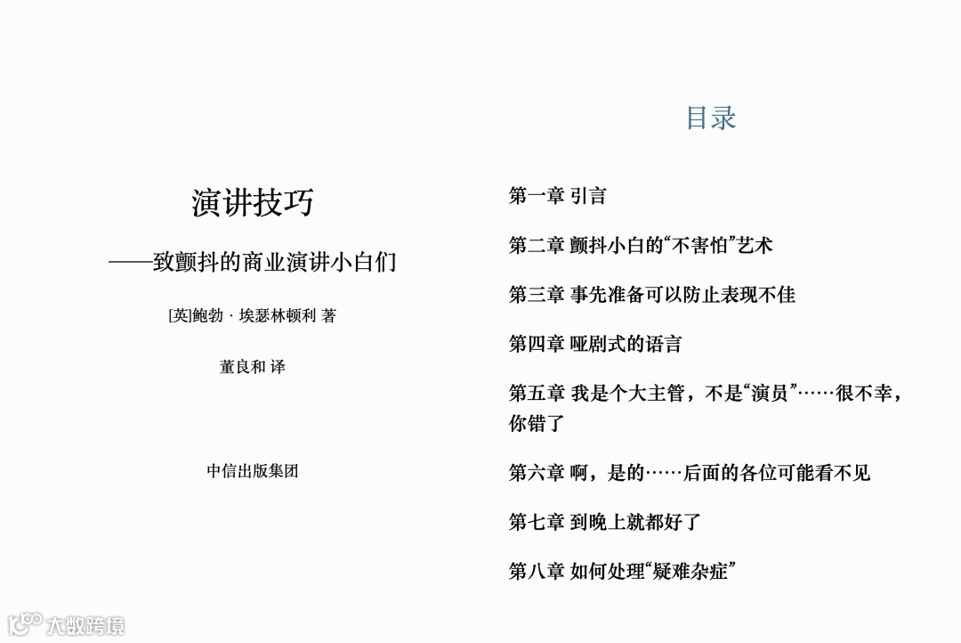 在商人的十大畏惧榜单中,蜘蛛、死亡、牙医、蛇和飞行都在列,但是位于靠前的是“公共演讲”。大多数商人对公共演讲已经畏惧到了无以复加的地步,以至于他们只想赶紧完成演讲后走下台去。基于作者曾为上千商人开设过的一种成功的培训课程,《演讲技巧:致颤抖的商业演讲小白们》一书指出,只要掌握了合适的技巧,任何人都可以自信笃定地面对大大小小的观众群做演讲。作者以一种幽默睿智的方式强调,即使你不是一位杰出的演说家,你也可以成为一名有效的商业演讲者。仅仅成为一名不错的演讲者就已经足够了,因为95%的商业演讲者都糟糕透了。