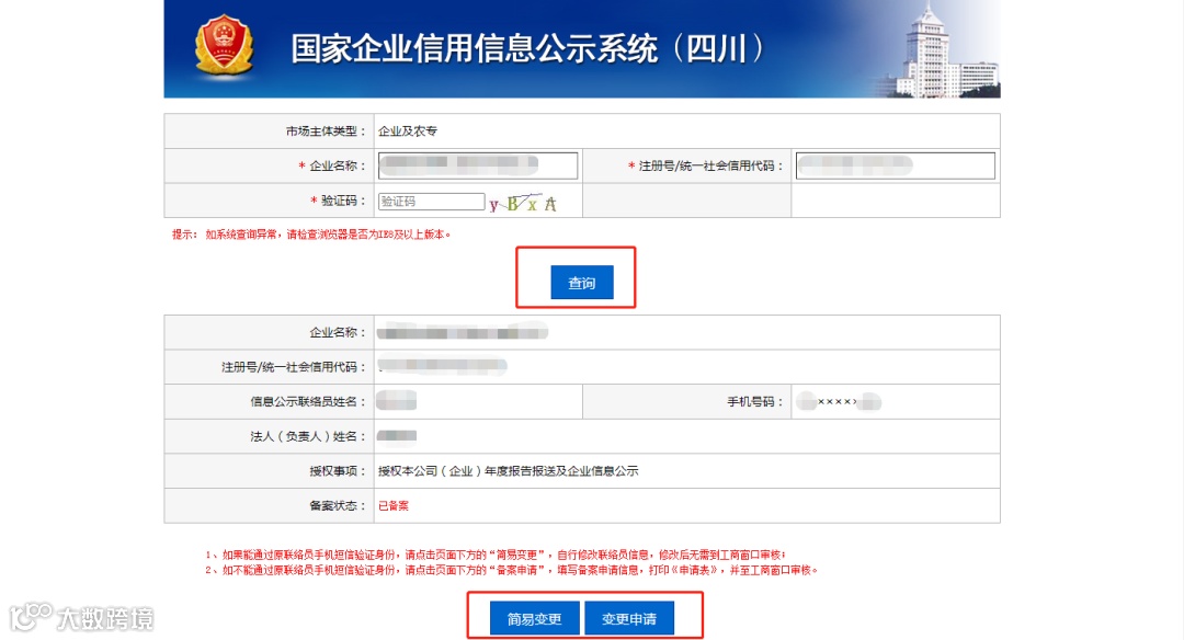 通过“查询”进入变更页面后,核实企业的联络员信息,可点击“简易变更”(能够通过原联络员手机获取短信)或“变更申请”(不能通过原联络员手机获取短信)执行变更操作。