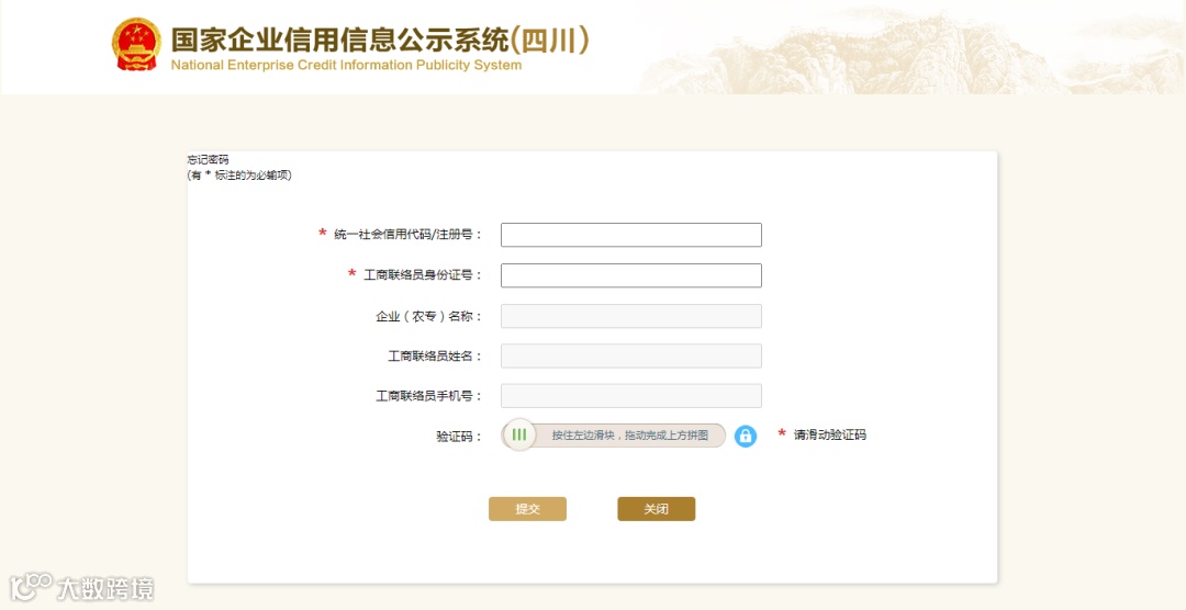 在登录界面“工商联络员登录”标签下,选择“获取初始密码”,填入相关企业信息后点击“提交”,即可通过已备案的联络员手机号获取相关登录信息。