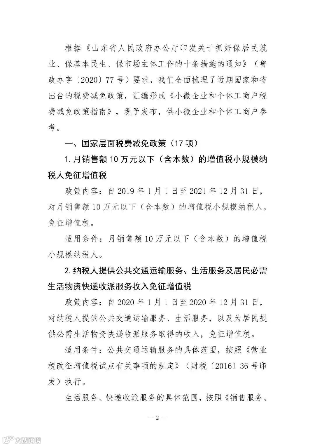 山东省财政厅发布山东省小微企业和个体工商户税费减免政策指南