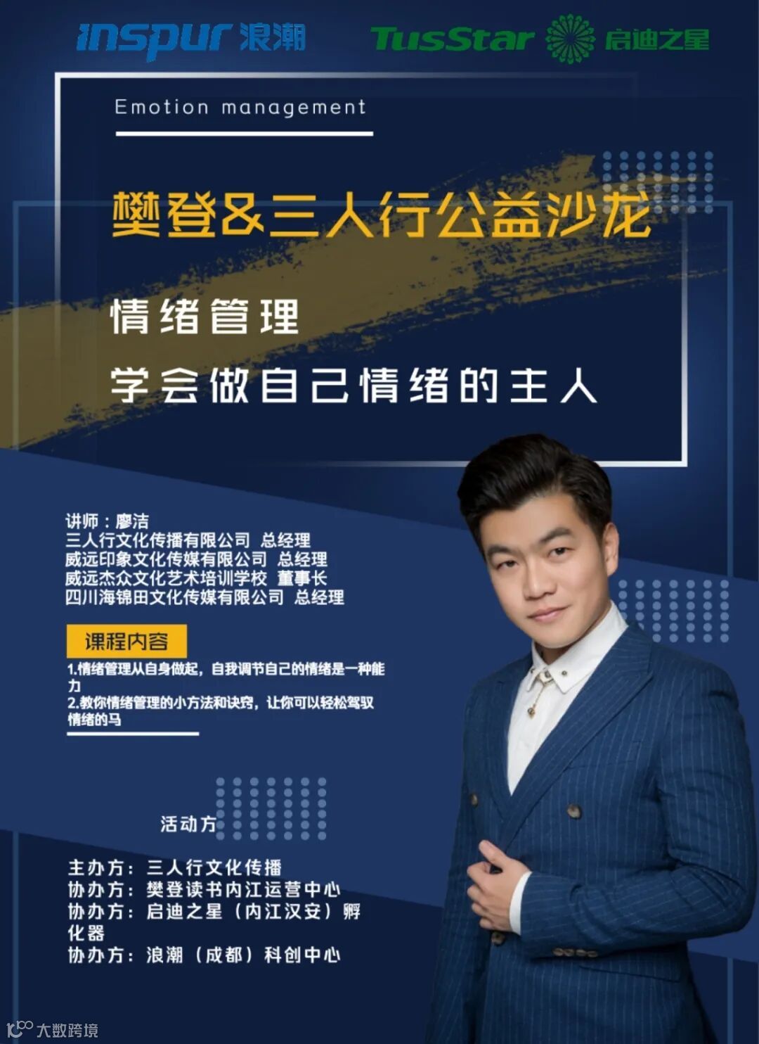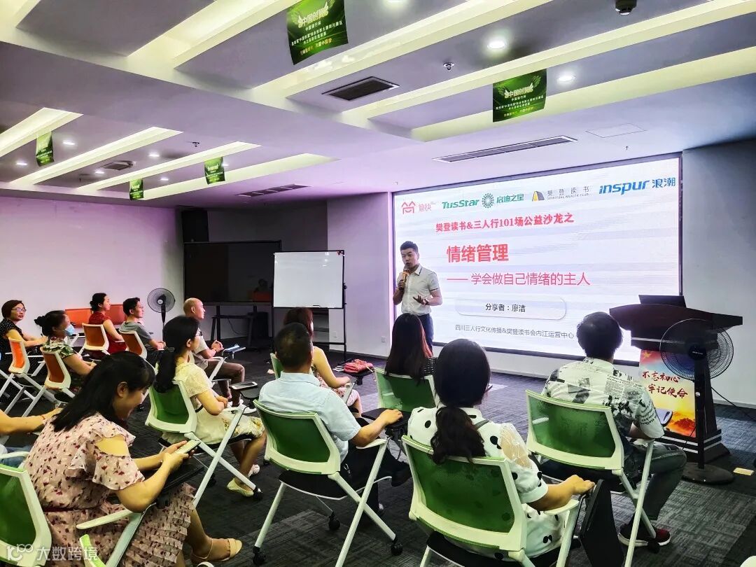 为此,6月29日晚上,由三人行文化传播有限公司主办,浪潮(成都)科创中心、樊登读书内江运营中心、启迪之星(内江汉安)孵化器共同协办的“樊登&三人行公益沙龙——情绪管理主题讲座”活动有序展开。本次课题分享活动邀请到三人行文化传播有限公司总经理、威运杰众文化艺术培训学校董事长廖洁讲师进行课题分享。