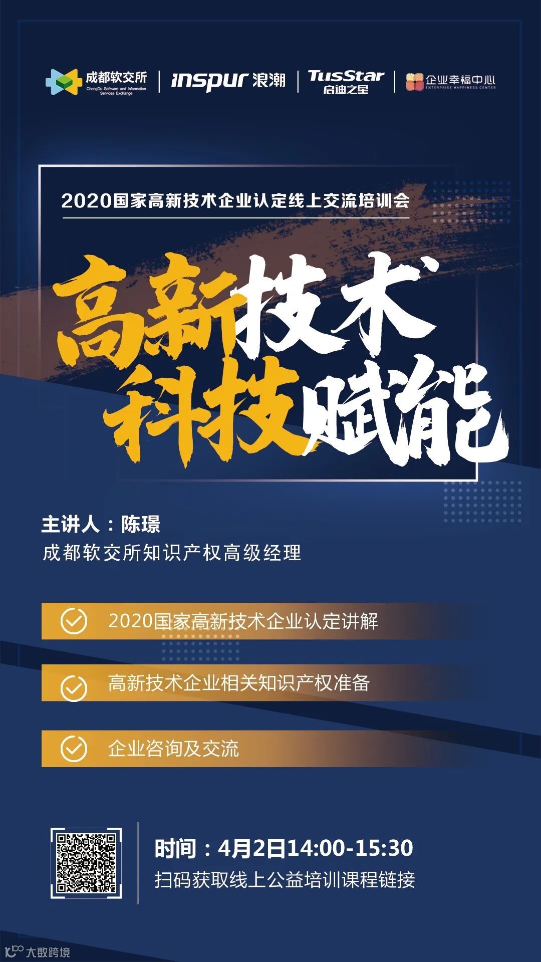 高新技术企业认定需要哪些条件?涉及的财务指标及要求是什么?如何解读高企财税优惠政策?有哪些需要关注的问题?为帮助科创企业更好地解读高新技术企业申报要求及优惠政策,浪潮(成都)科创中心将联合成都软交所举办2020年国家高新技术企业认定线上交流培训会。