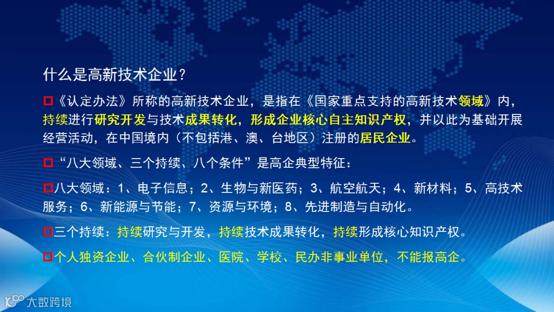 是指在《国家重点支持的高新技术领域》内,持续进行研究开发与技术成果转化,形成企业核心自主知识产权,并以此为基础开展经营活动,在中国境内(不包括港、澳、台地区)注册的居民企业。