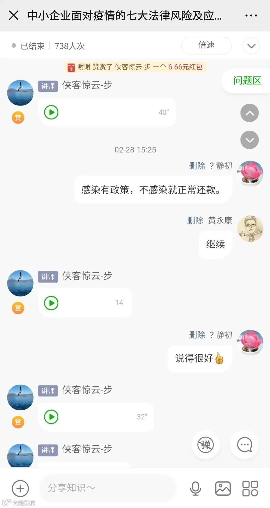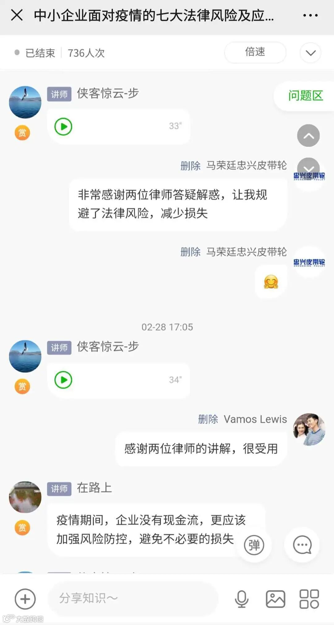 直播中,两位律师从“劳动用工法律风险 ”、“合同履行法律风险”、“诉讼时效法律风险”、“银行贷款偿还及逾期征信法律风险”、“纳税申报法律风险”、“企业捐赠法律风险”、“个人信息泄露法律风险”等七个方面入手,通过剖析实际案例,抽丝剥茧、总结规律,让听众透过现实情况了解相关法律条文规定,并掌握应对措施。本次直播共吸引了七百多人次收看,留言互动积极,反响良好,不少听众直言:“这个直播讲座真及时,解答了心中的疑惑,规避了法律风险,减少了损失。”