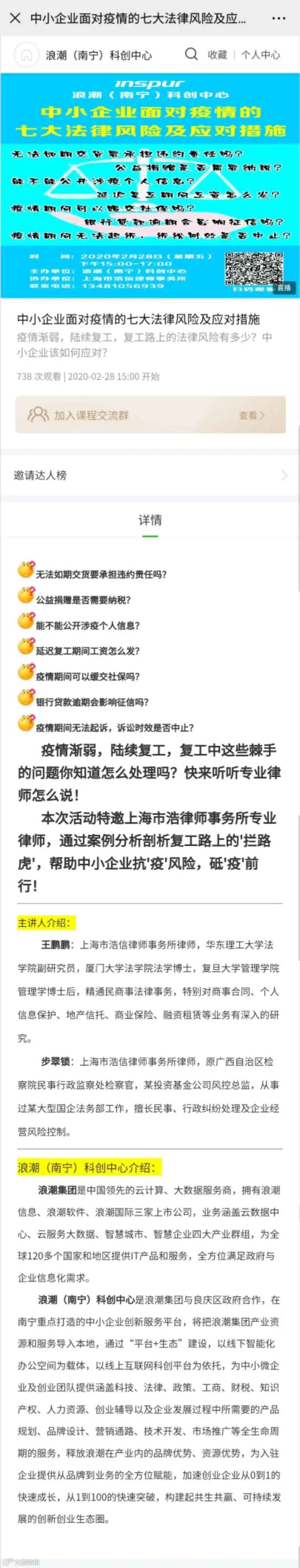 针对企业实际需求,2月28日下午,浪潮(南宁)科创中心邀请上海市浩信律师事务所王鹏鹏、步翠锁两位资深律师,免费对中小企业进行线上培训,为企业顺利复工提供法律援助。
