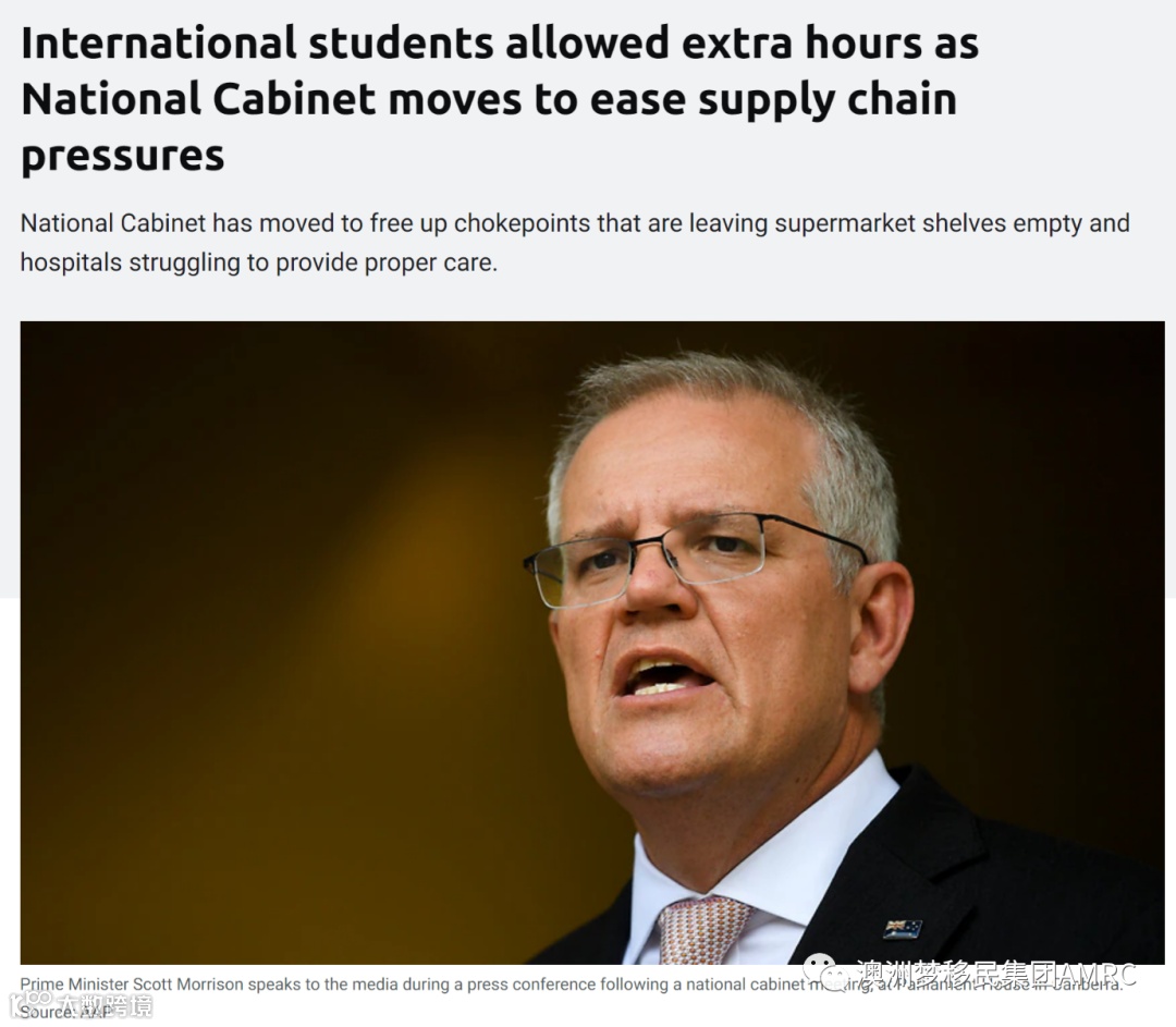 澳洲总理斯科特·莫里森(Scott Morrison)于2022 年1月13日宣布,联邦取消了对国际学生每两周工作40 小时的限制,以帮助缓解COVID工人短缺。
