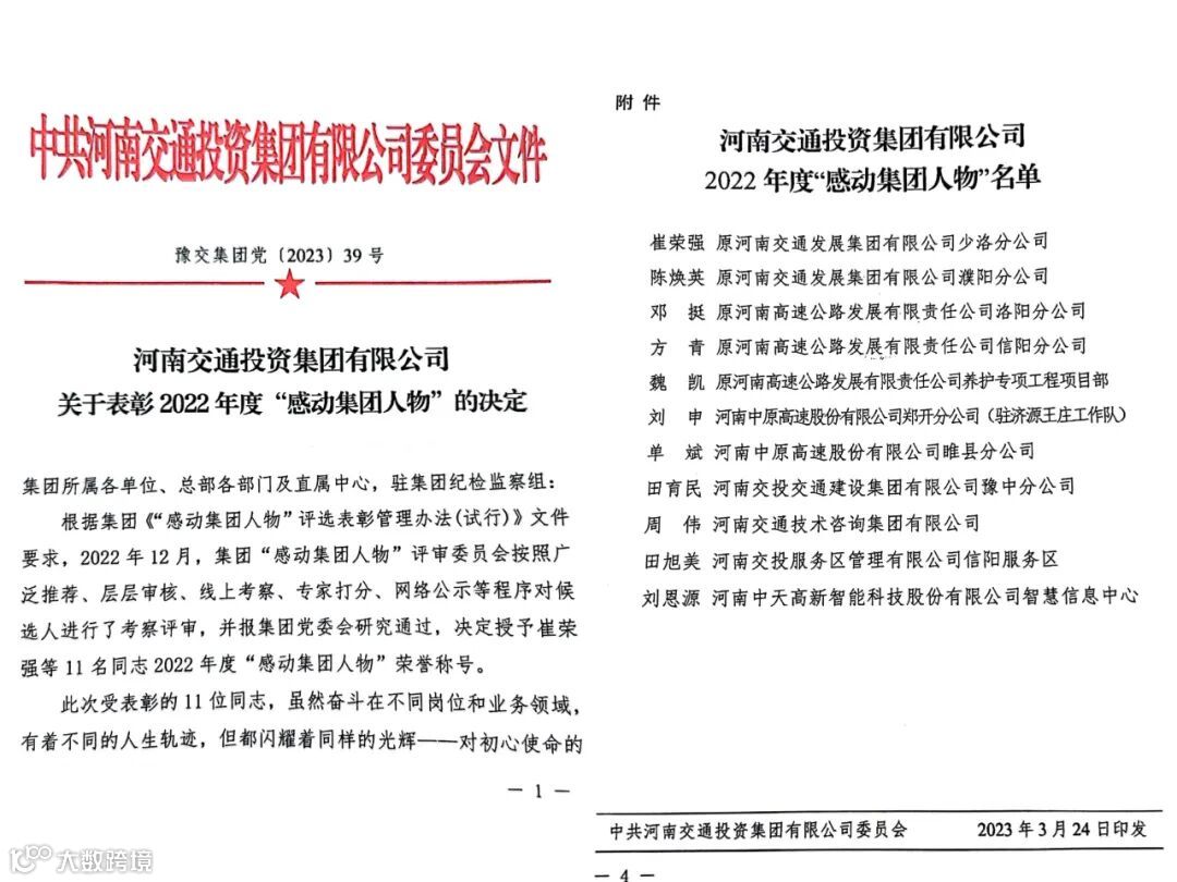 3月27日,交投集团举行2022年度感动集团人物表彰大会,公路监理公司许信高速第一代表处总监理工程师周伟同志荣获“2022年度感动集团人物”荣誉称号。