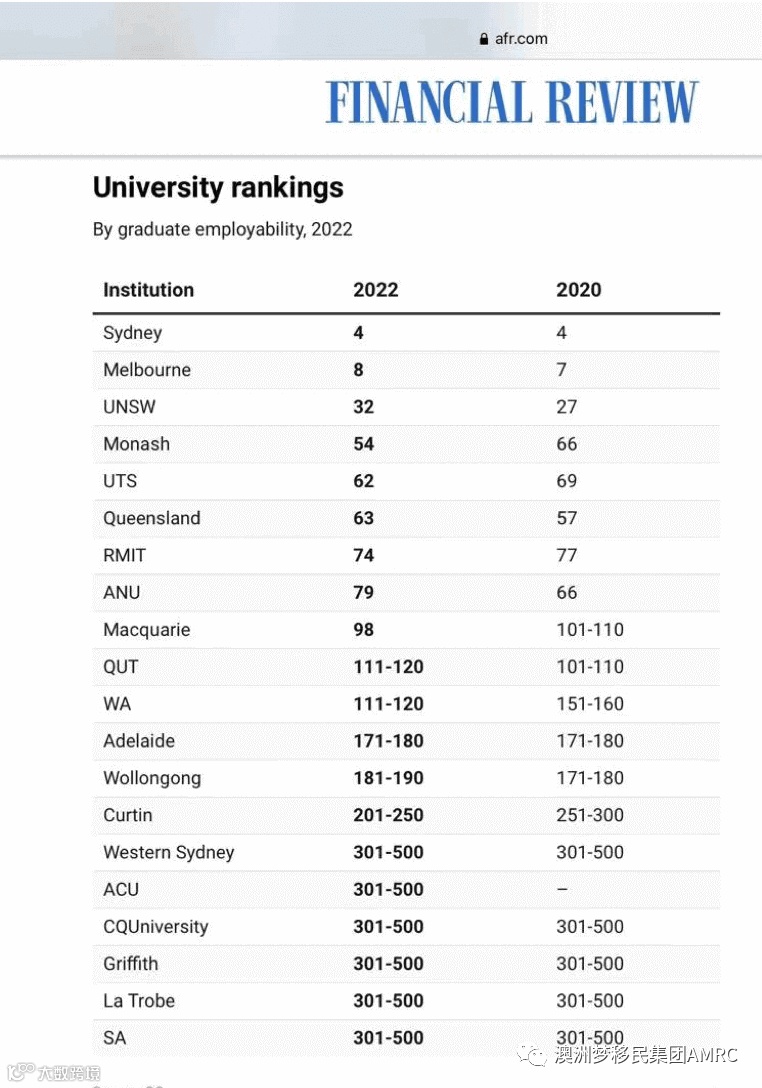 悉尼大学和墨尔本大学在2022年度毕业生就业率指数中分别排名第四和第七,麻省理工大学(MIT), 斯坦福大学和洛杉矶大学(UCLA)位居榜首。