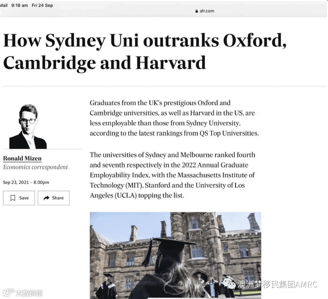 澳洲财经报报道,QS顶尖大学的最新排名显示,英国著名的牛津大学,剑桥大学以及美国哈佛大学的毕业生就业率不如悉尼大学的毕业生就业率。