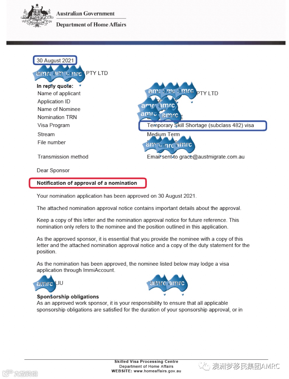 8月26日,澳洲梦为客户L先生和他的雇主M 公司分别递交了482工作签证的雇主提名(nomination)申请和签证(visa)申请。