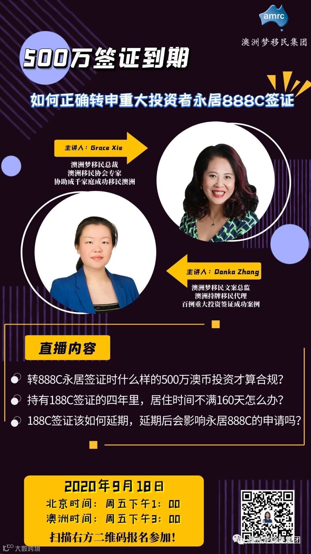 届时,澳洲梦CEO Grace Xie女士以及澳洲梦文案总监Danka Zhang女士将为大家讲解“如何正确转申重大投资者永居888C签证”,其中会包括500万签证申请人最关心的几个问题: