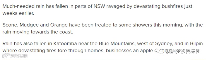 今早,山火最严重的新南威尔士州,Scone、Mudgee和Orange已经降雨,悉尼西部的蓝山附近的Katoomba和Bilpin也都下了雨,新州南部Batemans Bay也在降雨,本周晚些时候预计全州会有更多阵雨。昨晚的雷暴天气在维多利亚州的墨尔本各地形成强降雨和冰雹。这是横跨澳大利亚东部的大规模降雨的第一步,本周后期和周末将连续几天出现降雨和暴风雨。