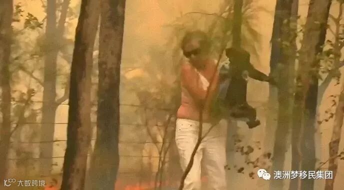 眼见不远处一只考拉在大火中艰难行走,一位穿白衣的女士不惧大火冲了过去,一把抱住考拉,将它带离火海。