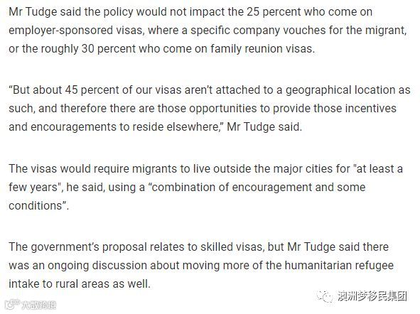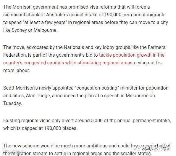 昨天,人口和城市基础建设部长阿兰 塔奇Alan Tudge宣布了最新的移民政策——根据现任政府总理莫里森的区域人口计划,政府已经承诺改革现有签证制度,迫使每年计划总量190,000名的澳大利亚永居移民中的一部分,在边远地区“至少呆上几年”,才允许迁往悉尼、墨尔本等大城市。