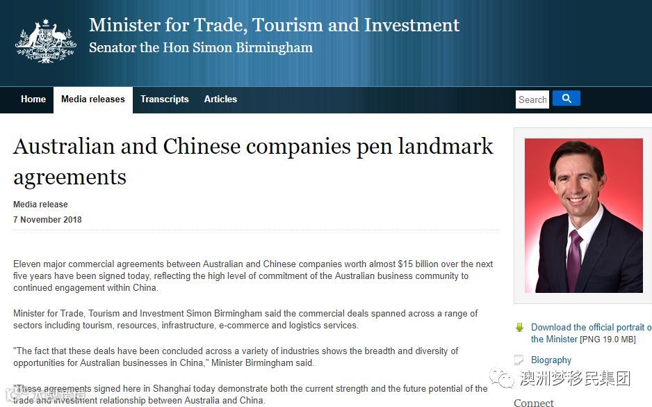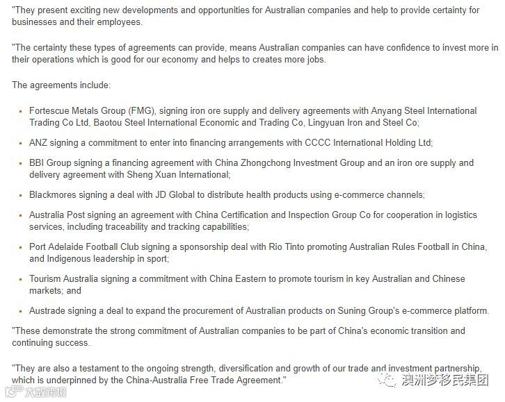“今天在上海签署的这些协议展示了澳大利亚与中国之间贸易和投资关系的当前优势和未来潜力。”