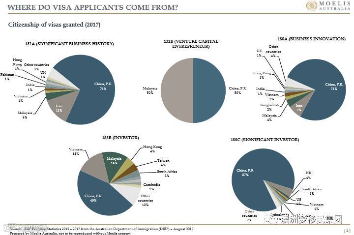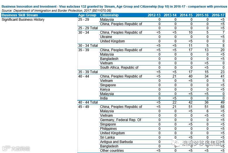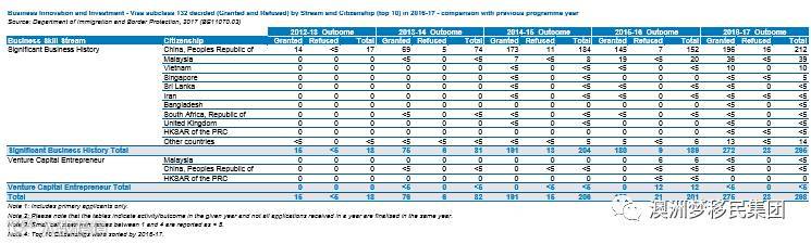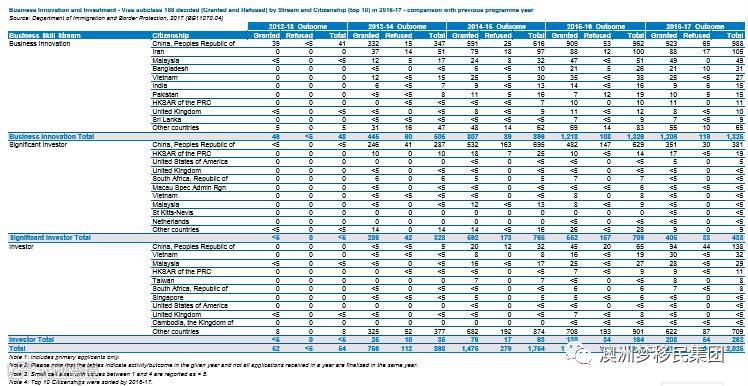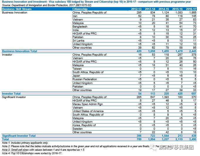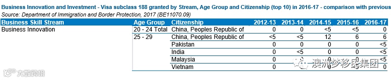 ·188B商业投资移民签证2012-2017各财年数量分别为16/53/118/257/378,占据60%以上份额,越南,香港,马来西亚,台湾,南非,日本,俄罗斯,英国,巴基斯坦分别位于中国之后;