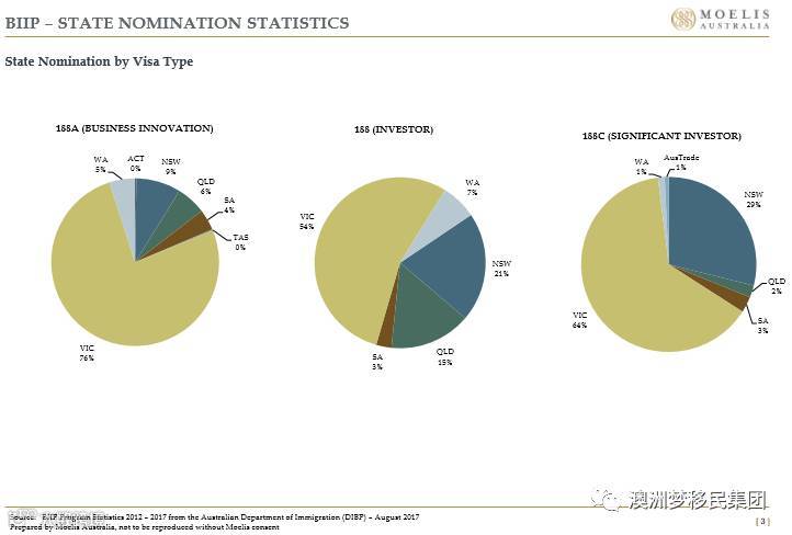 ·188A商业创新移民签证各州提名分布比例为维州76%,西澳5%,首都领地0%,新南威尔士9%,昆士兰6%,南澳4%,塔州0%;