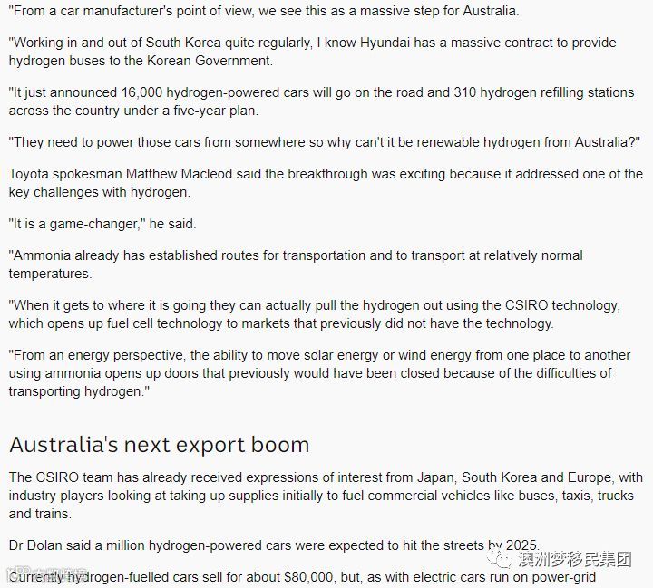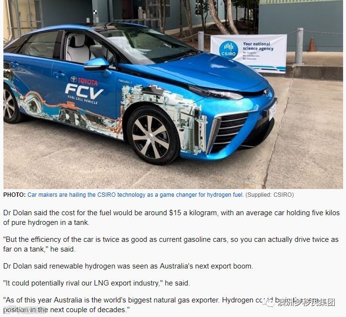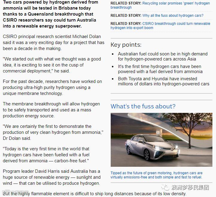项目负责人大卫 哈里斯David Harris说,澳大利亚拥有巨大的可再生能源——太阳能和风能,可用于生产氢气。CSIRO的研究人员找到了将澳大利亚制造的氢转化为氨的方法,这意味着它可以安全地运往亚洲的巨大市场。然后再使用膜技术转化为氢气,然后泵入氢动力汽车,日本、韩国和新加坡有数万辆氢燃料电池动力汽车——澳洲又找到了新型能源的出口方案。以前因为氢的易燃性和不稳定性,长途运输一直是个难题。
