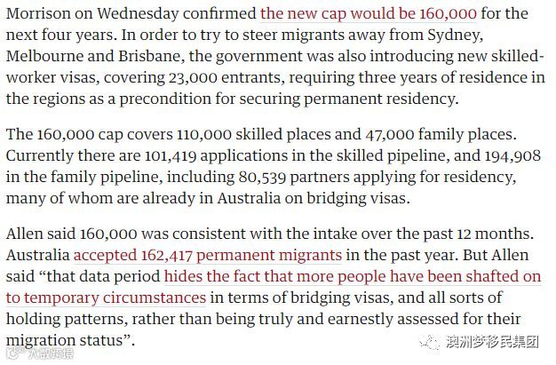 艾伦表示,16万上限与过去12个月的移民输入量一致,澳大利亚在过去一个财年接受了162,417名永居移民。但艾伦说:“数据隐藏了这样一个事实,即在签署过桥签证等各个方面,有更多的人处于临时居住状态,而不能真实反应他们的移民身份。这个政策会使更多人在几年里处于进退维谷的境地,我们的政府利用人家的技能却不想给他们回报。”