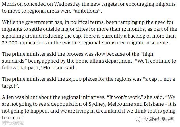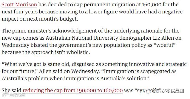 针对澳洲政府总理斯科特 莫里森宣布将年度移民数量上限从19万降低到16万并推行新移民“上山下乡”政策,澳大利亚国立大学人口统计学家抨击——这是个“糟糕的”政策,会造成多年的“后遗症”。