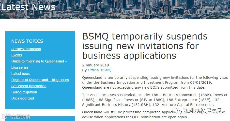 暂停原因是昆州的商业投资移民2018-2019财年份额用完了。昆州政府在向联邦政府申请增加份额。重新开启时间不得而知,取决于新份额的获得。