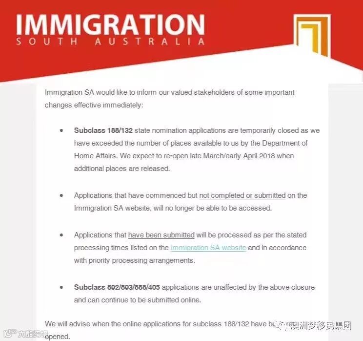 南澳也有关闭商业投资移民的历史——2018年1月31日,2017-2018财年刚刚过半,南澳州政府宣布因为用完了联邦给的配额,暂时关闭了南澳商业投资移民。随后南澳州政府向联邦内务部申请增加商业投资移民配额,并于2018年4月12日重开,当天南澳州政府就接到了大批投资移民提名申请,瞬间用完了全部新的配额,然后南澳州政府又宣布再次关闭商业投资移民。