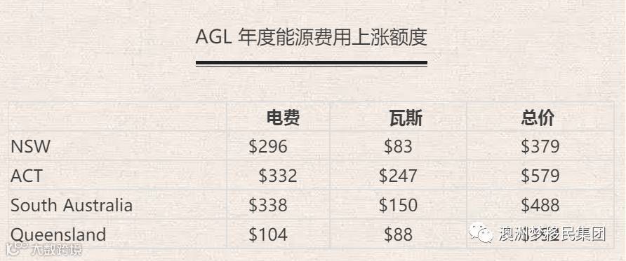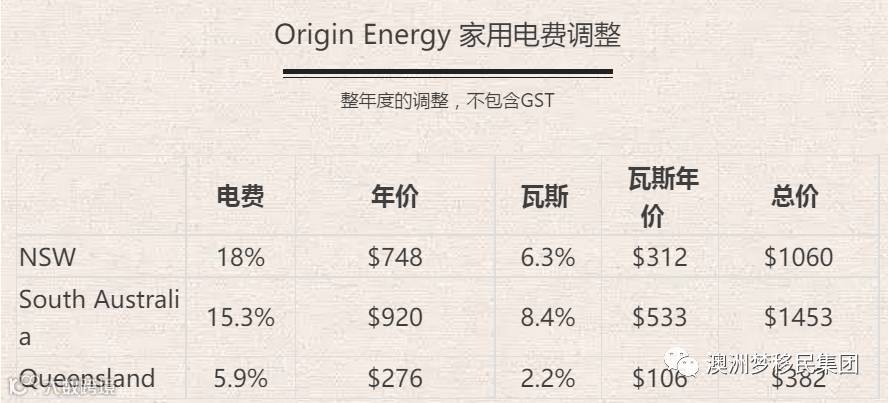 从2017年7月1日开始,Energy Australia、Origin Energy、AGL三家能源公司对新南威尔士州、南澳、昆士兰州、首都领地的电费和燃气价格进行上涨调整。部分地区最高涨幅达18%。