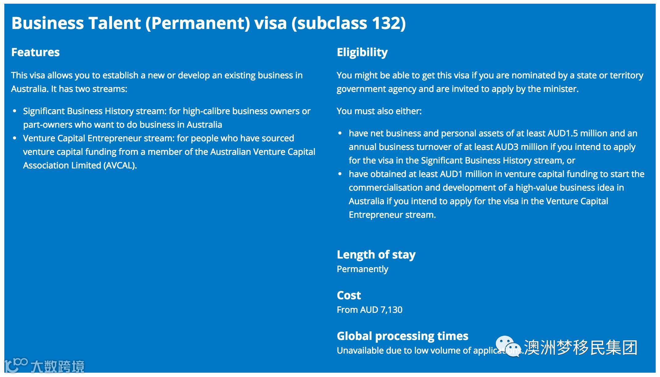 132商业天才移民签证属于澳洲商业投资移民类签证,用以吸引符合资格的大型企业主或股东到澳洲设立新企业或参与现有企业管理的签证,申请人可一步到位获得澳洲永居身份。