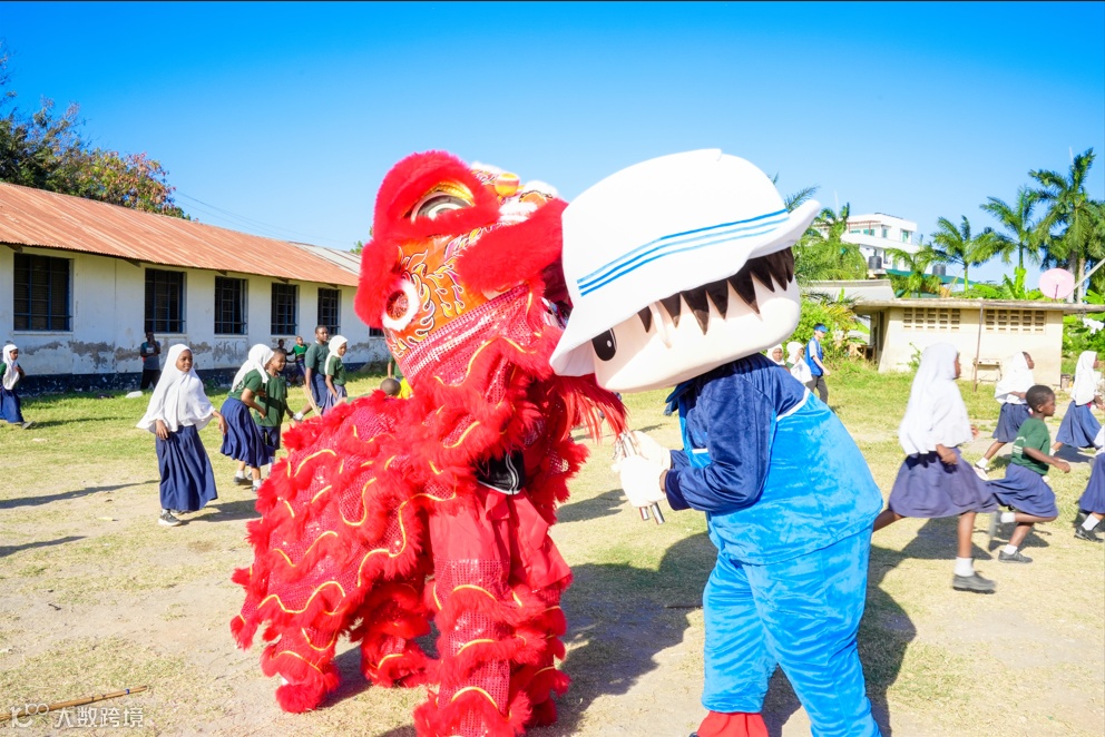 活动当天,随着锣鼓声“咚咚锵”地响起,坦桑尼亚孔子学院舞狮队的表演正式拉开帷幕。两头红黄相间的狮子踩着鼓点跃入场中,时而仰头甩头,时而俯身打滚,蓬松的狮毛在阳光下闪闪发亮。当狮子朝着孩子们的方向“扑”过来时,前排的孩子先是下意识往后缩,随即又被狮子俏皮的模样逗得哈哈大笑;孩子们围在周围,有的伸手触摸狮身,有的跟着鼓点拍手,近距离感受中国传统文化的魅力;中交员工身着“交交”玩偶,和分公司员工同孩子们手拉手玩起了转圈圈游戏,笑声与欢呼声此起彼伏,语言的隔阂在互动中消弭,只剩下纯粹的快乐与亲近。