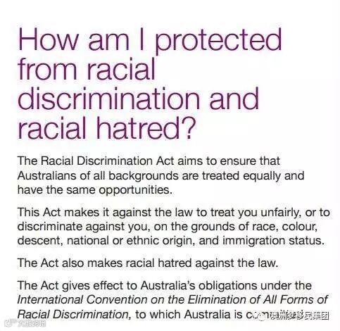 反观澳洲,虽然也经历过种族歧视,但在几十年前,澳洲的政治精英们就意识到,一个充满歧视、抱残守缺的澳洲是没有未来的。于是制定法律禁止任何基于种族、肤色、血统、国籍、人种、移民状况的歧视行为,澳洲从宪法上彻底否定种族歧视行为。