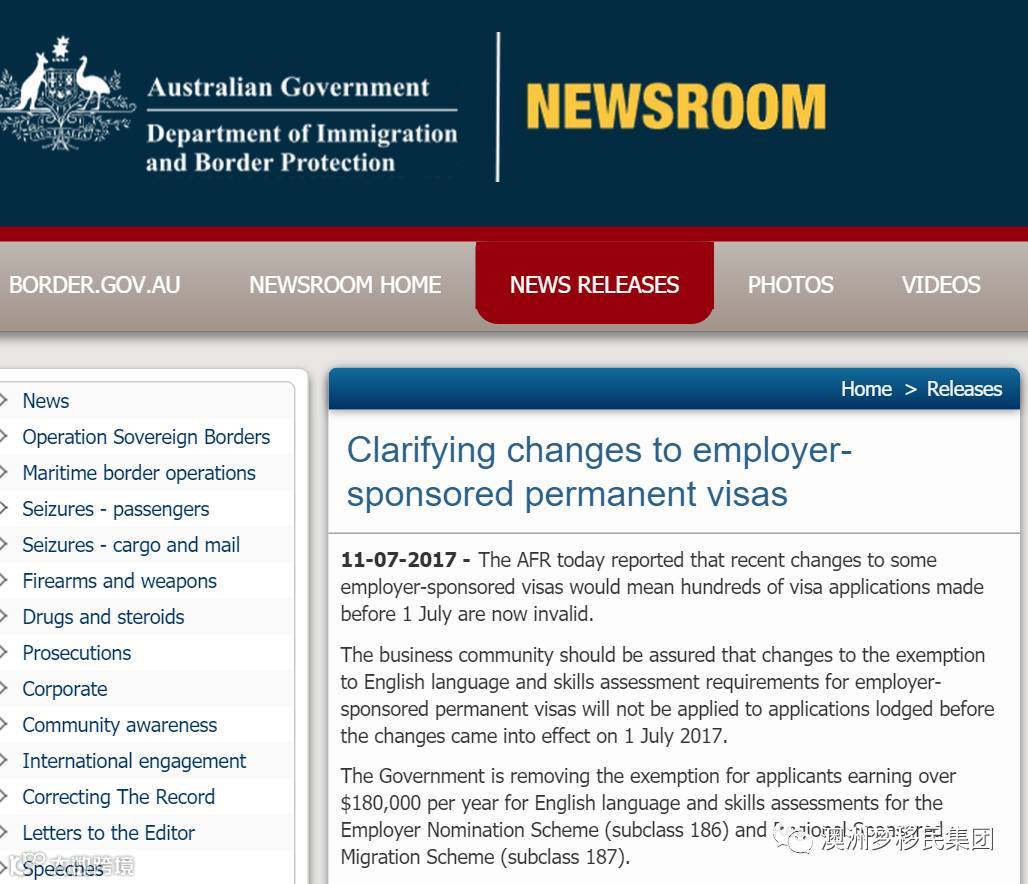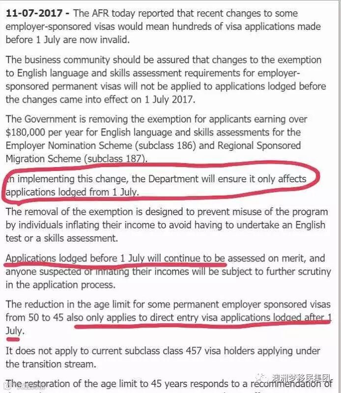 今天,7月12日一早,澳洲移民局DIBP发出消息,确认关于雇主担保类移民签证的186/187变政范围只涉及到2017年7月1日以后提交的申请,2017年7月1日以前的申请仍可享受高薪豁免英语和职业技能要求的待遇,同时享受50岁的年龄上限!