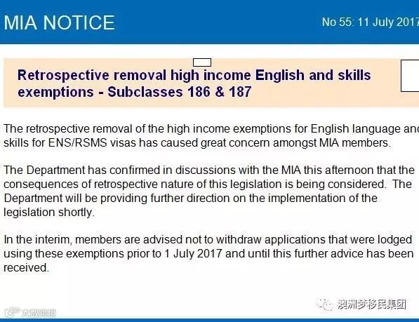 2017年7月11日,澳洲移民协会MIA“就回顾取消186/187签证高薪豁免英语及职业技能的问题”发出第55号通知,综合考虑到协会会员及相关人员和企业的强烈反应,移民局已经决定于7月11日下午和澳洲移民协会举行会议,审慎考虑法条变更,并尽快发出相关法条的进一步改善措施。澳洲移民协会MIA建议2017年7月1日前递交相关签证的人士,不要撤销签证申请,静等移民局的下一步通知。