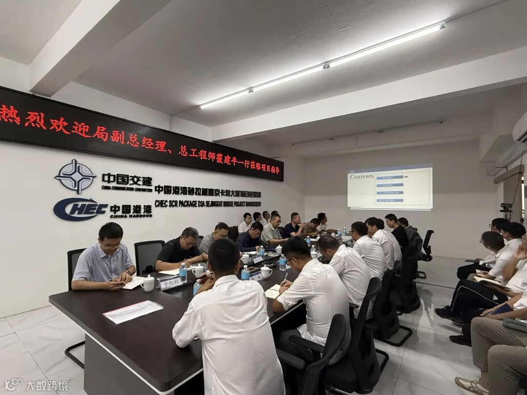 霰建平一行首先听取了项目负责人关于工程概况、基础管理、主梁及斜拉索施工情况和下一步工作重点的具体汇报,并与设计研究院团队就塞京卡特大桥挂篮现场预压施工情况分析、关键风险点及施工监控等问题进行了深入研讨。