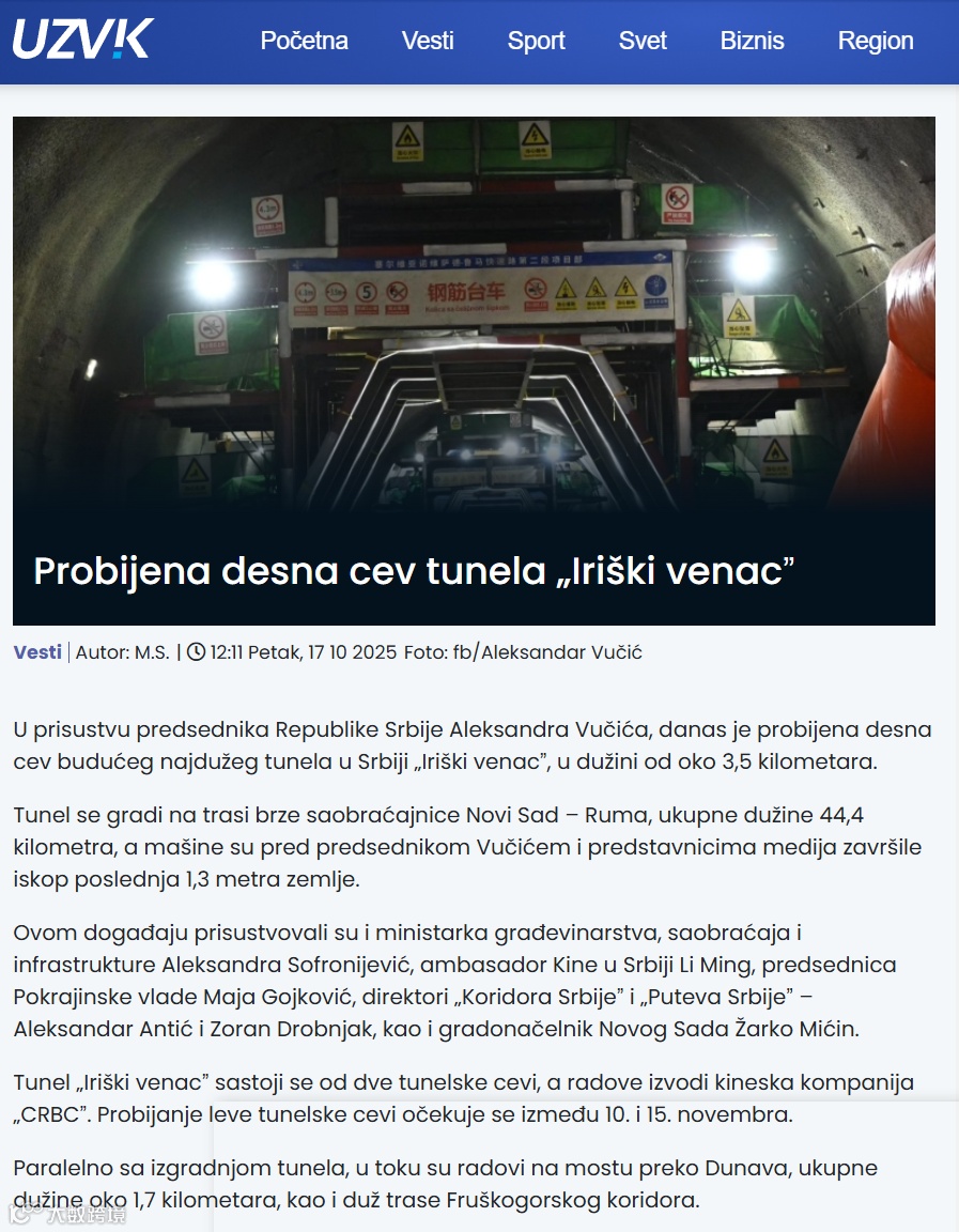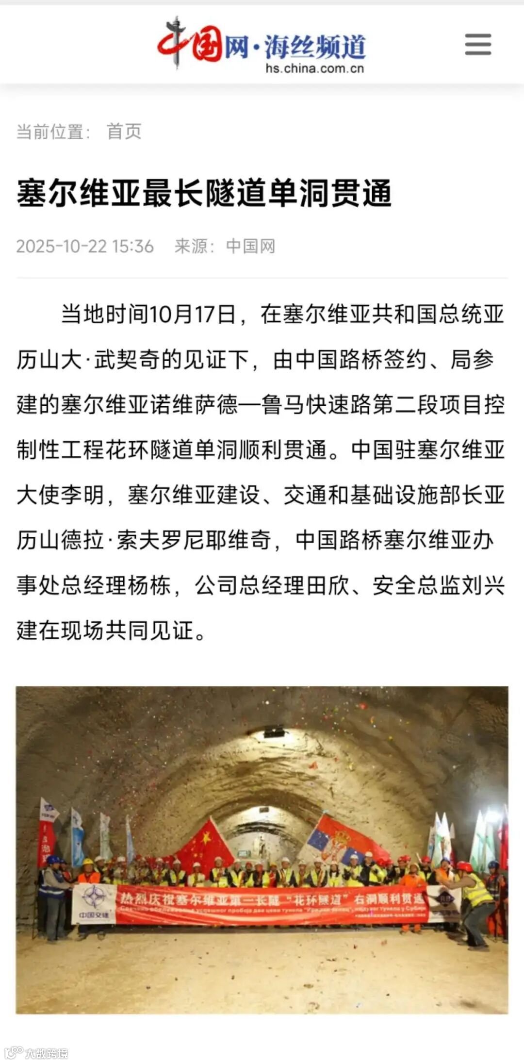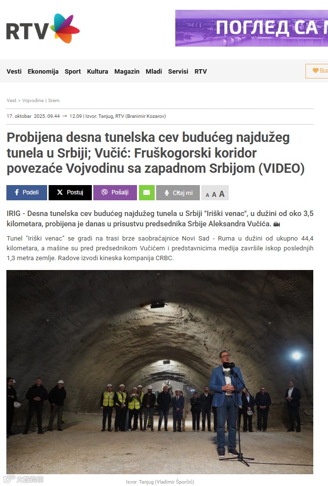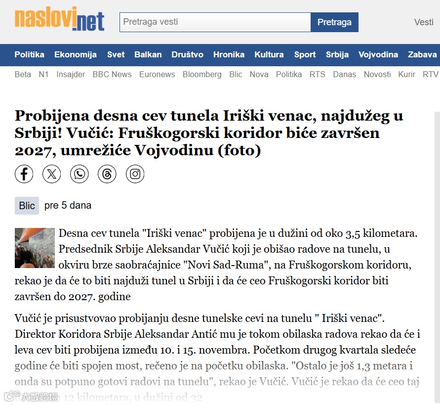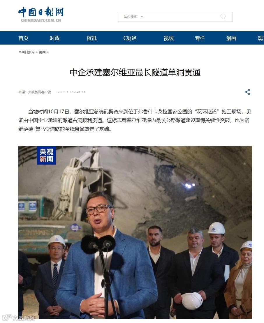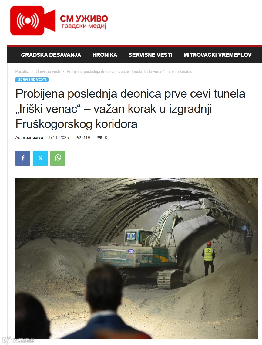 10月17日,在塞尔维亚共和国总统亚历山大·武契奇的见证下,由中国路桥签约、局参建的塞尔维亚诺维萨德—鲁马快速路第二段项目控制性工程花环隧道单洞顺利贯通,国内外主流媒体高度关注,央视新闻、中国日报、中国网等国内主流媒体,RTS、Blic、Euronews Srbija、RTV (Vojvodina)、Novosti、buducnostsrbijeav(武契奇总统官方社交媒体账号)等塞尔维亚当地主流媒体纷纷发布相关新闻报道。
