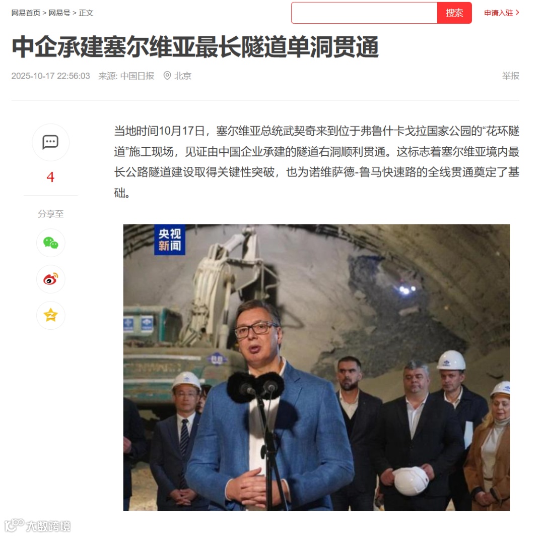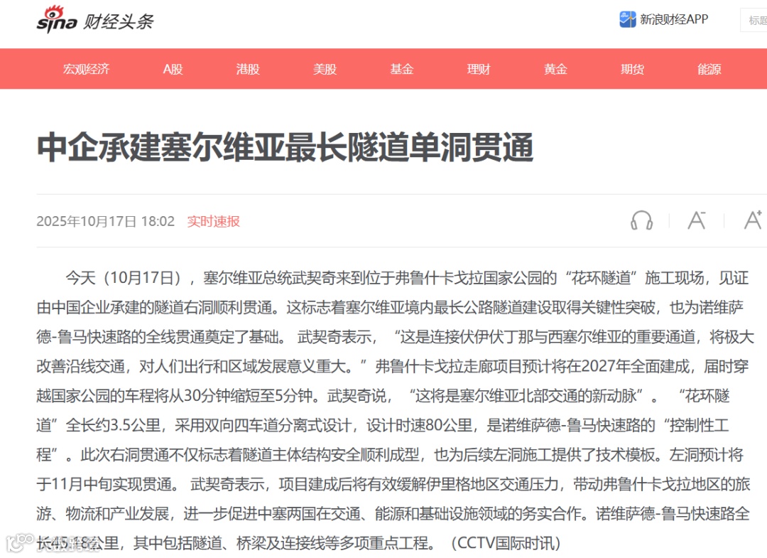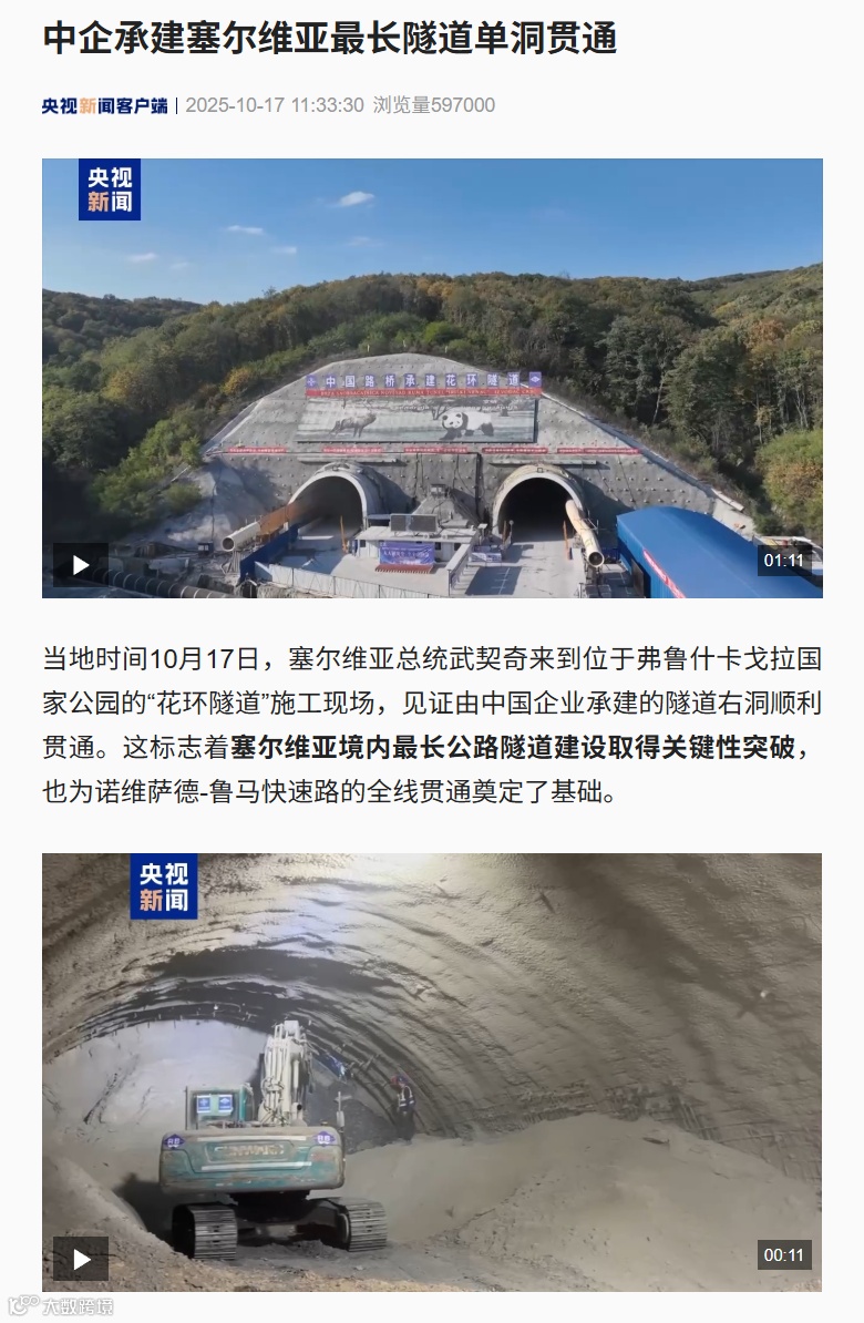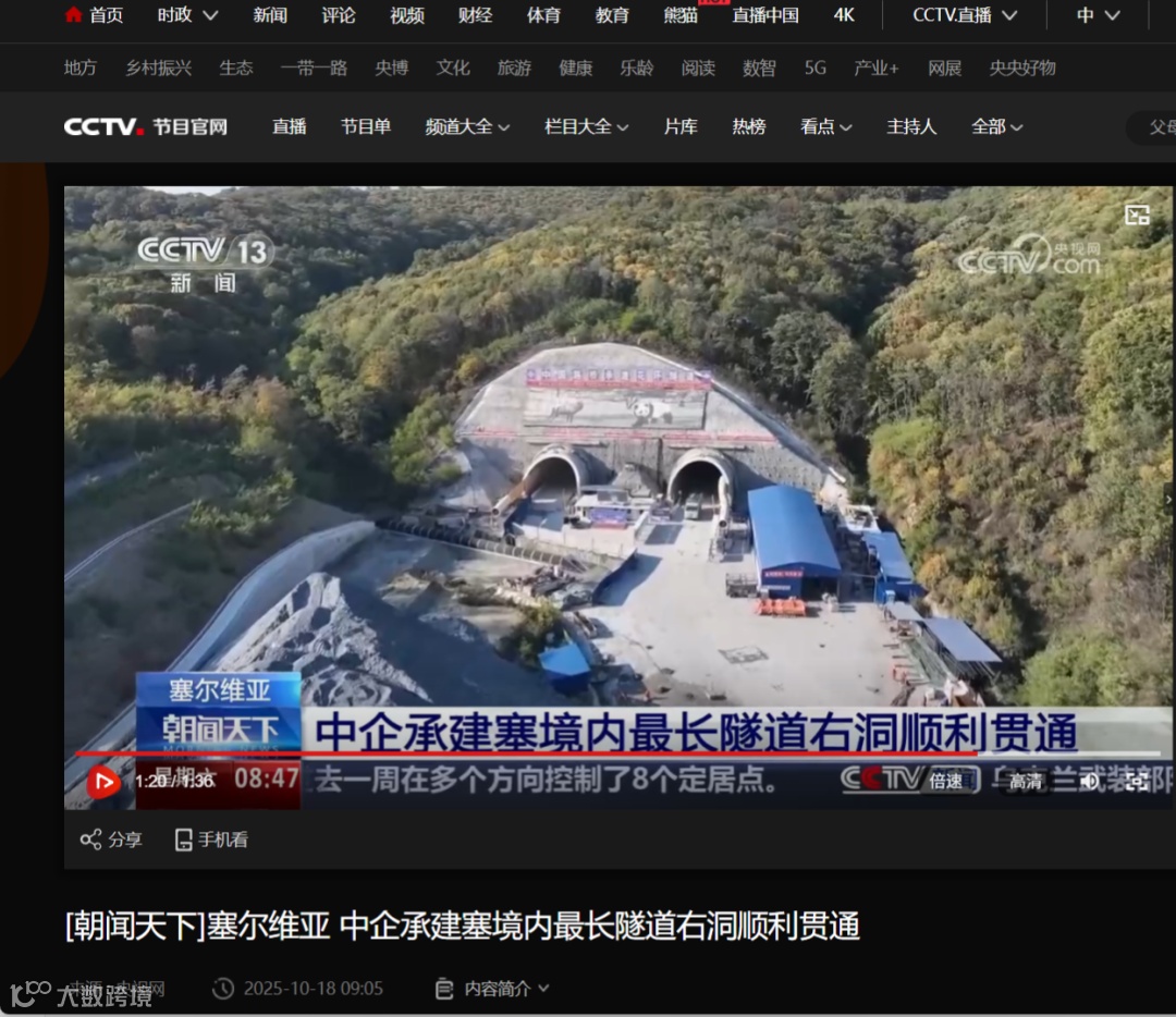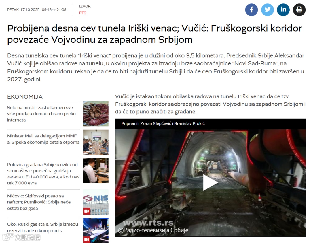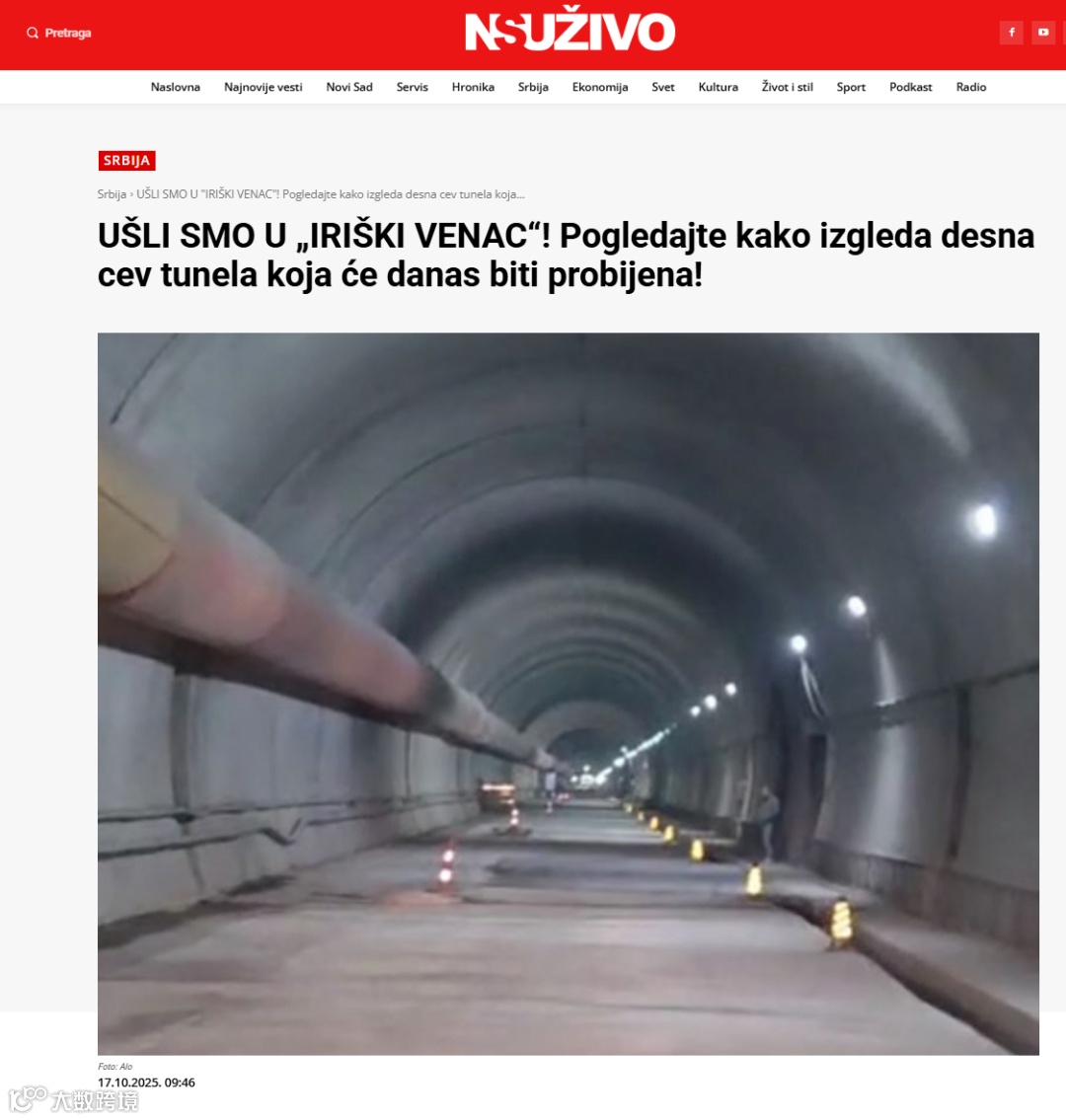 10月17日,在塞尔维亚共和国总统亚历山大·武契奇的见证下,由中国路桥签约、局参建的塞尔维亚诺维萨德—鲁马快速路第二段项目控制性工程花环隧道单洞顺利贯通,国内外主流媒体高度关注,央视新闻、中国日报、中国网等国内主流媒体,RTS、Blic、Euronews Srbija、RTV (Vojvodina)、Novosti、buducnostsrbijeav(武契奇总统官方社交媒体账号)等塞尔维亚当地主流媒体纷纷发布相关新闻报道。