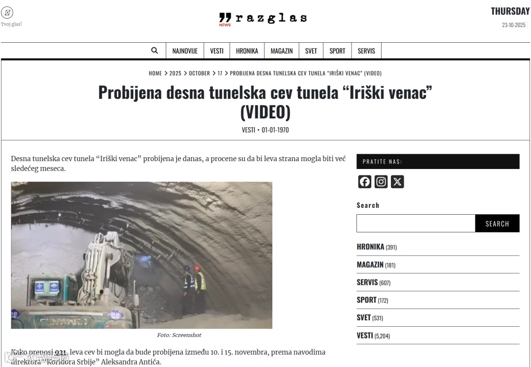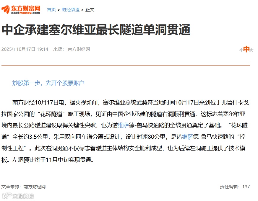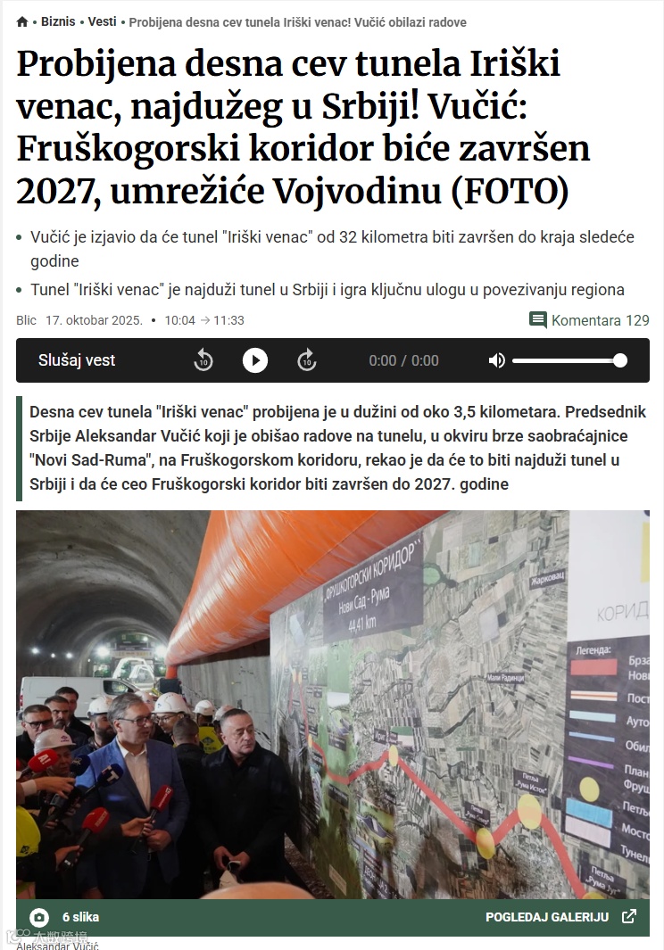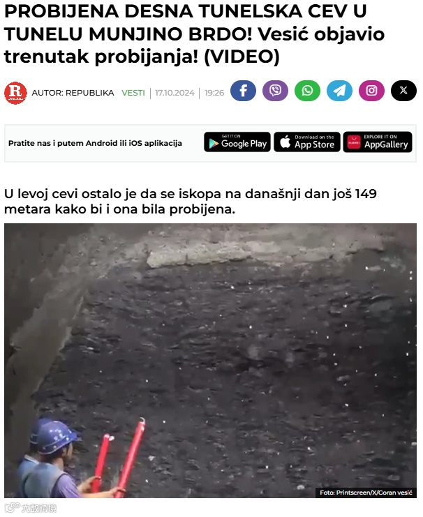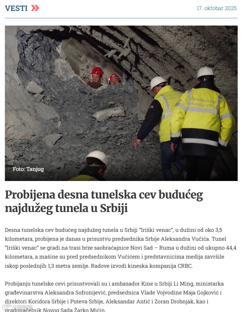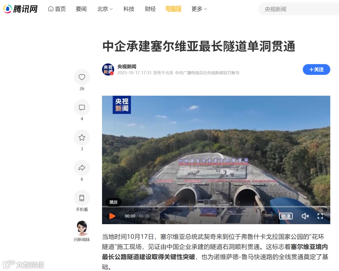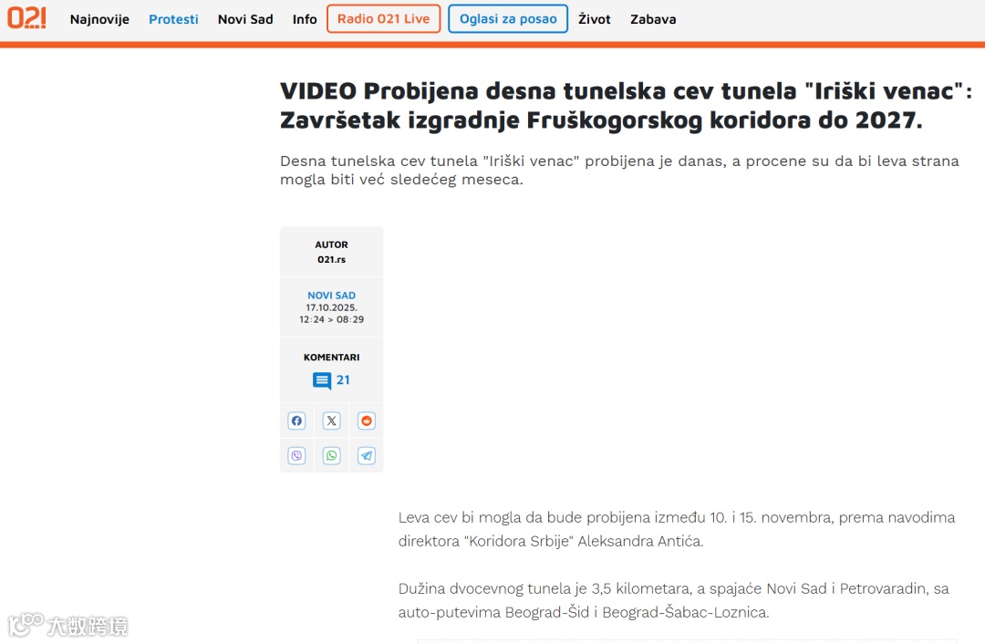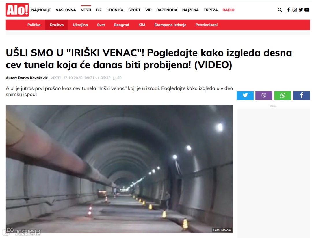 10月17日,在塞尔维亚共和国总统亚历山大·武契奇的见证下,由中国路桥签约、局参建的塞尔维亚诺维萨德—鲁马快速路第二段项目控制性工程花环隧道单洞顺利贯通,国内外主流媒体高度关注,央视新闻、中国日报、中国网等国内主流媒体,RTS、Blic、Euronews Srbija、RTV (Vojvodina)、Novosti、buducnostsrbijeav(武契奇总统官方社交媒体账号)等塞尔维亚当地主流媒体纷纷发布相关新闻报道。