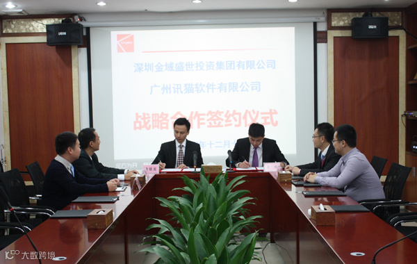 2014年12月10日上午,金域盛世投资集团地产事业部总裁黄锐龙、深圳前海金域盛世科技有限公司总经理杨宇鹏与广州讯猫软件有限公司总经理吴烁在集团总部一楼的大会议室进行了会晤,就物联网的商业地产O2O智能解决方案(简称微商务)的合作达成共识,签署了战略合作框架协议,结成战略合作伙伴,开启了双方深度、多赢、长期合作之门。