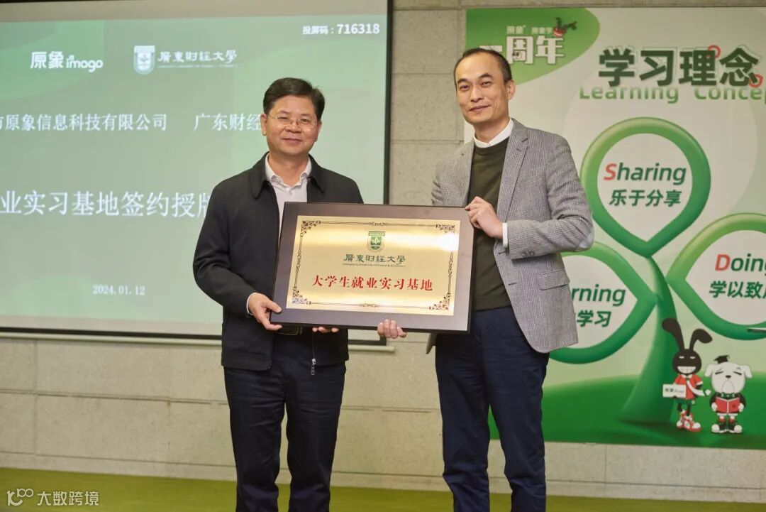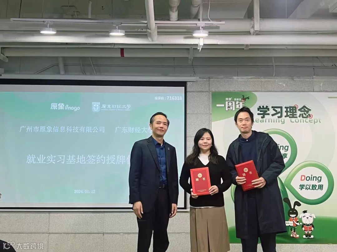 2024年1月12日,原象举行广东财经大学就业实习基地签约授牌仪式。广东财经大学党委常委、副书记罗贤甲,艺术与设计学院党委书记杨长春,艺术与设计学院党委副书记林强,艺术与设计学院副院长宋琦,数字媒体艺术系主任梁羡荣,视觉传达设计系主任蒙萃桦等校方领导,原象CEO 首席执行官马耀,COO 首席运营官赖栋,人力行政部总监邓素颜,创意部资深设计总监邓新利,以及毕业于广东财经大学的品牌运营总监林淑琴,助理人事经理冯诗琴等校友出席了本次就业实习基地签约授牌仪式。