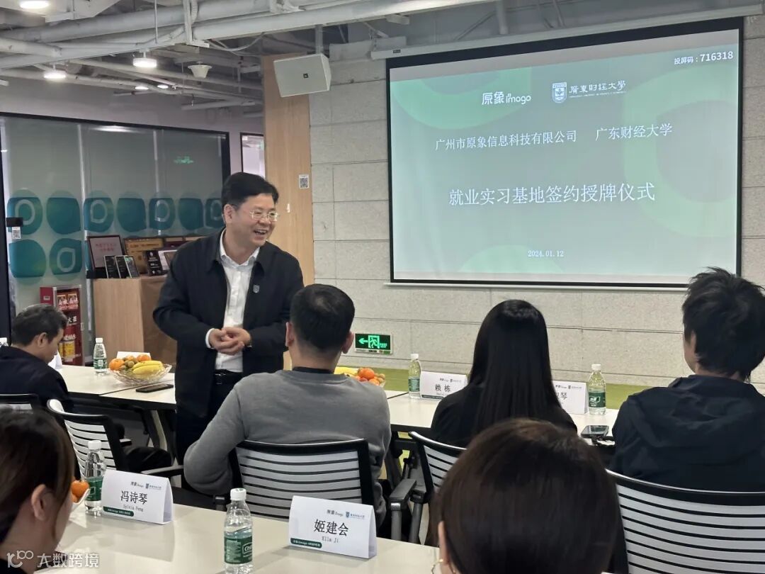 在仪式上,原象COO 首席运营官赖栋对广东财经大学与原象建立就业实习基地表示欢迎,并提到企业与高校合作,共建实习基地,不仅可以为学生提供实践机会,提升他们的就业竞争力,也能为企业引进高素质人才,增强企业的创新能力,多名校友在原象成长并担任关键岗位的工作,为企业发展提供持续的人才支持。