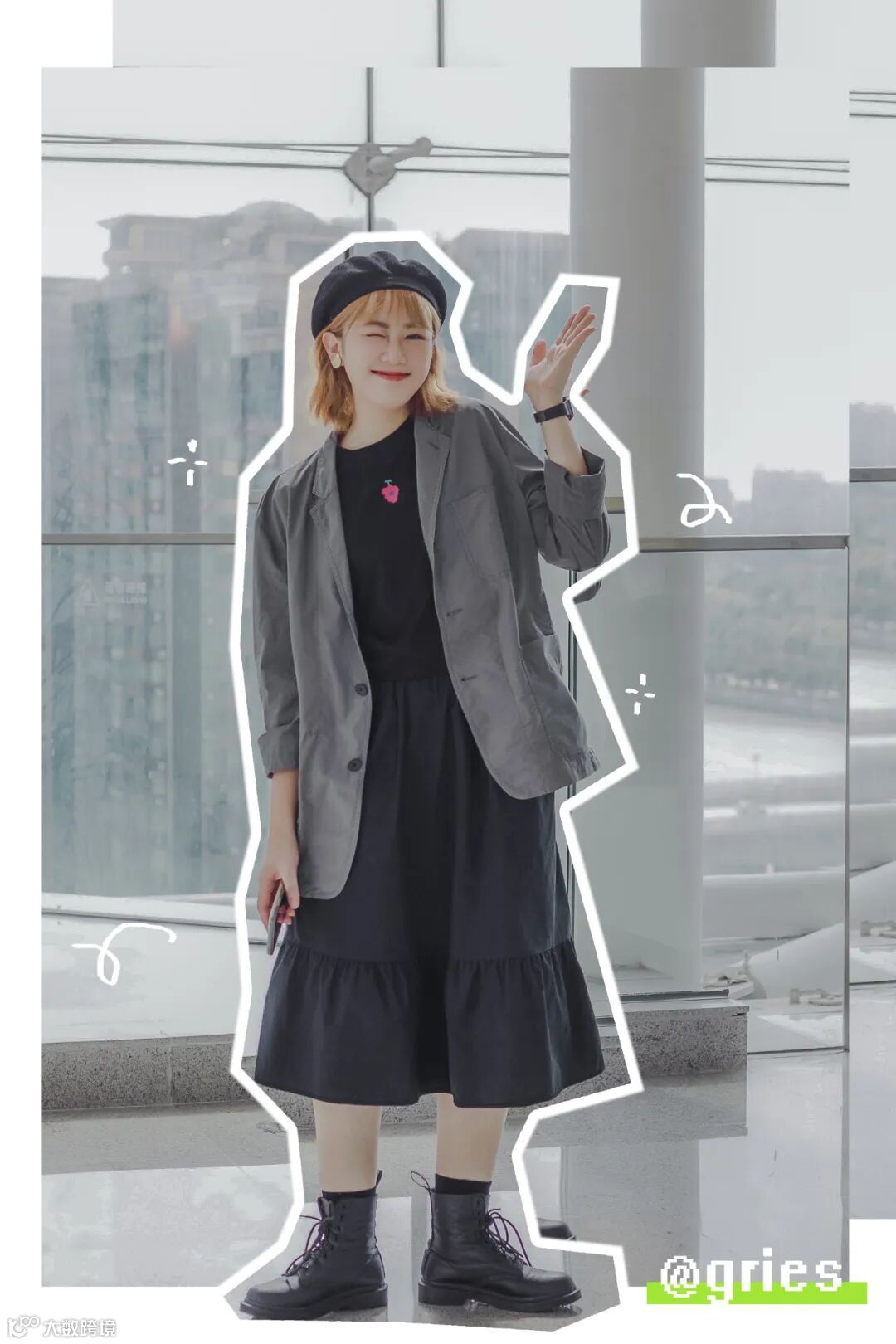 不同质感的小黑 tee + 小西装裙,搭配同样暗色系的西装外套,休闲中带一点点正式,打造出适合阿康的通勤装备!