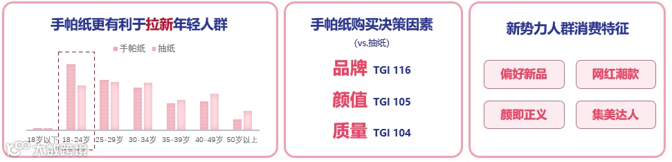 接下来我们要解决的问题就是 “产品卖给谁?”也就是定位新品营销的目标 TA。手帕纸的消费人群更集中在年轻用户,他们对品牌、产品颜值和质量都有较高的追求。而年轻用户正是偏好新品、网红潮款的集美达人,他们相信颜即正义。
