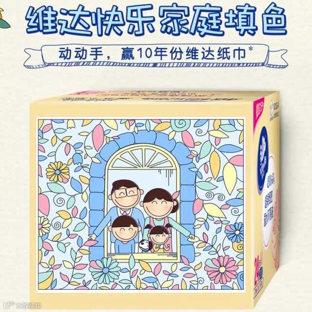 快递箱不仅是产品信息的载体,于品牌、消费者而言还能发挥更重要的沟通价值。针对有孩家庭为主的维达用户,团队打造了“快乐家庭填色H5活动”,为维达设计环保快递箱,在快递箱上以单色插画告知填色活动,邀请亲子们一起为环保纸箱创作填色,引导分享作品集赞赢10年份纸巾大奖。巧妙的快递箱引流、激发个性创作的轻互动体验,加上极具话题性的奖励机制,在0推广成本下上线一周吸引了123万用户参加和230万+的互动量。创造性赋予快递箱与品牌用户深度互动的价值,让消费者在好玩的亲子体验中,感受品牌快乐家庭生活的理念。