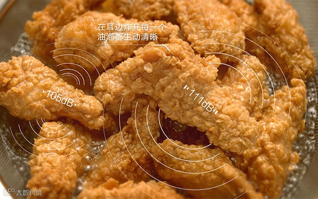 看完后呐喊着 “好饿”、“好下饭!!” 的观众们可能不曾注意到短片中几条线条的 “神助攻”:团队想到用几个线条作为创意符号,除了在听觉上 “听” 到炸鸡碰撞、火锅沸腾、可乐翻滚等等声音,也能在视觉上 “看” 到清晰、立体的音质。