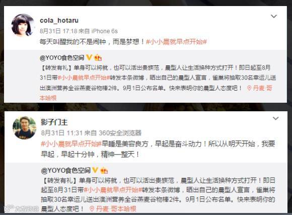 联合美食类声量前十的KOL进行创博。KOL发博文呼吁,晨型人更利于时间管理,早起做晨型人是一种健康新潮的生活方式。号召大家一起成为晨型人。