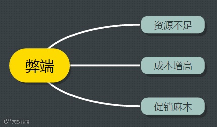 各大品牌对着平台资源(例如广告位或媒体推广)虎视眈眈,狼多肉少的大前提下,大多数品牌很难分到这一杯羹。同时,因为资源不足,成本相应增高,除了增加大量促销机制,降价、满减、送礼等等以外,还要同时投入更多的人力支持,徒增疲惫。